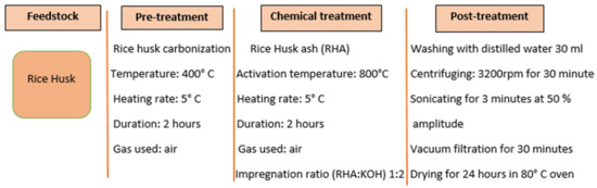 Othman et al. [67], prepared porous graphene by treating rice husk ashes at different stabilization temperatures. Rice husk was converted to solid residues called rice husk ash (RHA) at varying stabilization temperatures (100 °C, 200 °C, 300 °C, and 400 °C). The samples were denoted as GRHA100, GRHA200, GRHA300, and GRHA400 with respect to the pre-treatment temperature of each. Chemical activation using KOH at a 1:5 impregnation ratio yielded rice husk ashes-derived graphene (GRHA). The characterization was done using TEM, XRD, and Raman spectroscopy. A shematic illustration of the activation process of GRHA is shown in Figure 4. The stabilization temperature showed a major influence on the porosity of the as-synthesized GRHA. Increasing the temperature increased the number of volatiles released, with the formation of more micropores and resulting in enhanced BET-specific surface area and total pore volume (TPV) of GRHA. However, increasing the temperature increases surface properties but only to a limit; i.e., above the optimum temperature, a reduction of surface area occurs. The results clearly showed that GRHA obtained at a temperature of 200 °C exhibited the highest specific surface area; hence, 200 °C was considered the optimum stabilization temperature for GRHA.