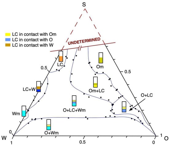 On the S/W axis, with a water content greater than 75% w/w, there is a small Wm region that corresponds to an O/W microemulsion or normal micellar solution [36,39,40]. On the same axis, there is another monophasic region that corresponds to lamellar liquid crystal LC that contains approximately up to 10% w/w of oil. The remainder of the diagram presents two- and three-phase regions in equilibrium.