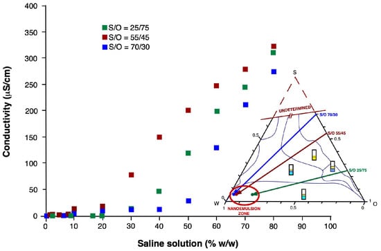 Figure 2 shows the electrical conductivity of the dispersions. The electrical conductivity was measured for different amounts of an aqueous phase in the dilution lines studied, S/O = 25/75, 55/45, and 70/30, at a constant temperature (30 °C). As expected, adding an aqueous phase to the dispersions where S/O = 25/75 increases the conductivity when the system leaves the zone (O + LC) and arrives to (Om + LC + Wm) with a water amount of 21 wt% and, finally, to the (O + Wm) regions with water amount of 42 wt%. Consequently, when the water increases from 40 to 80 wt%, the electrical conductivity increases linearly because the external phase of the dispersion is the aqueous phase.