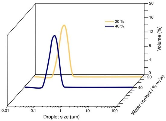 Figure 3 shows the NE’s distribution of the droplet size obtained in the line S/O 25/75 as a function of the water content in the initial dispersed system. By increasing the aqueous concentration in the initial dispersions, the proportion of bigger droplets increases, and its effect is observed in the bimodal distribution of the droplet size of the final NE. This behavior is also observed in the S/O 70/30 dilution line (Figure 4), where the bimodality of the NE is also present.