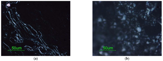 Figure 7a shows the oily lines, which are named from their appearance, of the dispersed S/O 25/75 system whose initial water content corresponds to 20%. This texture is due to defects that subdivide the ideal structure composed of flat and parallel layers into domains and appears as long bands with a complex internal structure [46].