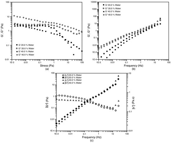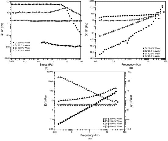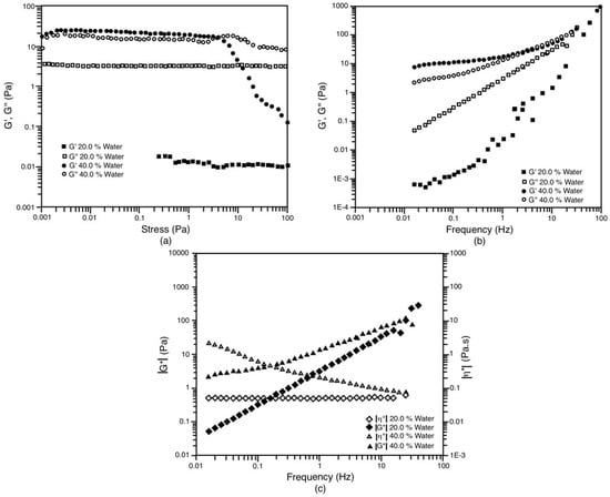 Oscillatory tests for the system with the dilution line S/O = 55/45 at 30 °C. The liquid crystal is in equilibrium with the Om phase and the Om and Wm phases in the case of 20% and 40 wt.% of water, respectively. (a) Amplitude shear stress sweep at 1 Hz; (b) Frequency sweep at 0.1 Pa; (c) Evolution of |G*| and |η*| against frequency.