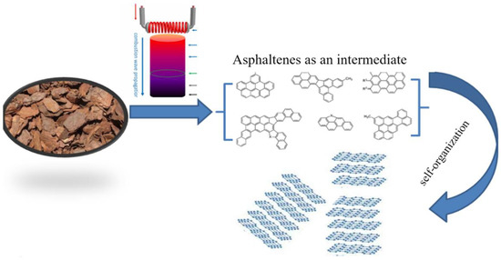 Synthesis of few-layer graphene (FLG) was carried out under the conditions of a self-sustaining high-temperature synthesis process (SHS). To obtain FLG, lignin powder was mixed with an oxidizing agent (ammonium nitrate) in a ratio of 1:1, and the resulting mixture was placed in the reactor and heated to a temperature of 220 °C using an oil bath. The detailed synthesis procedure is described in [14]. The model of 2D nanocarbon formations in the SHS process is shown in Figure 1. Under the combination of extremely high temperatures and an aggressive gaseous environment, lignin degrades to asphaltene primitives, which organize into graphene structures.
