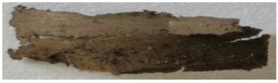 The starting porous silicon (por-Si) powder was mixed with FLG powder in a ‘drunken barrel’ type homogenizer for 30 min to obtain a homogeneous mixture. The FLG concentration was 1.25, 2.5, 5, and 10 mass %. The obtained mixtures were added to a 5% acetone solution of fluoroelastomer SKF-32 (fluorine content 54–56%) and mixed in an ultrasonic field (ultrasonic bath ‘Sapphire’, 50 W, 22 kHz) for 30 min at room temperature. As a result, samples of energy-saturated composite por-Si/FLG/SKF-32 were obtained with the following ratios: 50/1/25/48.75, 50/2.5/47.5, 50/5/45, and 50/10/40. A pyrotechnic composition with a 50/0/50 ratio of components was used as a reference sample. The introduction of a composite filler into the polymer solution volume led to the formation of a high-viscosity system, which can be attributed to the effective immobilization of polymer macrochains on the surface of composite filler particles. To eliminate the porosity of the obtained energy composite, it was dried in air at room temperature for 24 h in the first stage. Finally, the solvent was removed by holding it in an air thermostat for three hours at a temperature of 70–85 °C and for three hours at a temperature of 120–135 °C. The dried composition was a thin brown film (Figure 2).