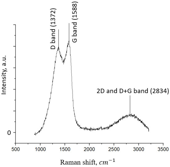 The intensity ratio of the D and G peaks is 0.96, which is similar to the Raman spectra observed in [17]. In [18], the authors linked the mutual overlap of the 2D and D + G peaks in the 2500–3500 cm–1 region with the wavy structure of the samples, the presence of many edges, and the different directions of graphene layers overlapping.