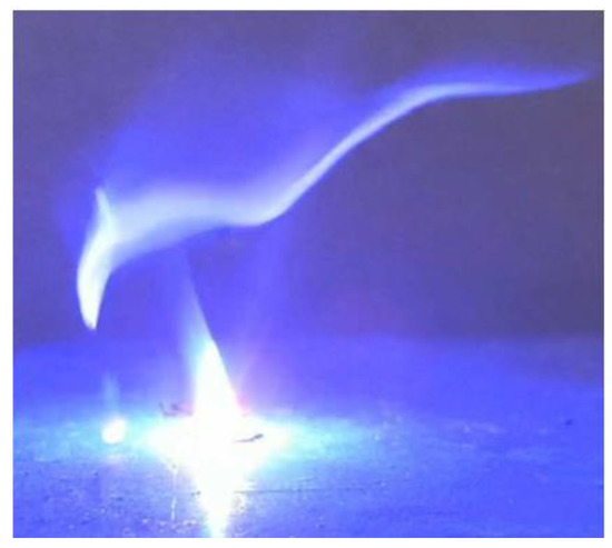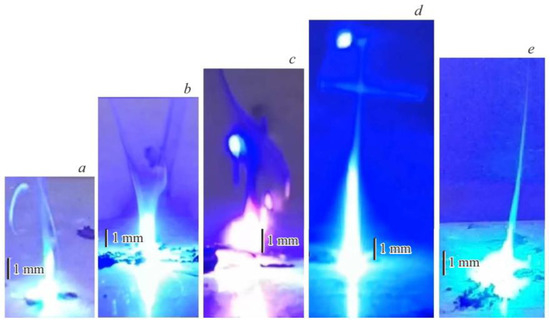 The burning intensity of films with FLG content of 2.5 mass % and mass 5% was higher than that of previously studied films Figure 7a,b (Figure 7c,d). It should be noted that only these two films of energy composites continued to burn after the end of exposure to the laser beam. For example, Figure 8 shows a photo of the combustion of a composition containing 2.5 mass % FLG 5 ms after laser irradiation.