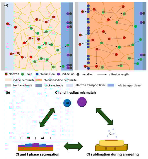 The bandgap of halide perovskite is determined by metal cation and halide anion orbital couplings. Different halide ion combinations change the perovskite lattice to enhance or reduce wavefunction overlapping and result in different bandgaps. Generally, perovskites with a bandgap greater than 1.65 eV are defined as wide-bandgap perovskites. Introducing bromide ions with iodide ions is a common strategy for making wide-bandgap perovskites []. Higher-bandgap perovskites cut out most of the solar spectrum in the longer-wavelength region. Therefore, higher-bandgap PSCs are not suitable for single-junction solar cells. It is observed that introducing a trace quantity of Cl can dramatically improve the optoelectrical and morphological properties while maintaining a bandgap similar to that of MAPbI3. For example, the electron diffusion length is almost ten times longer []; the carrier lifetime is substantially prolonged to 1 µs []; and the grain size increases to the range of µm from the nm scale []. Some interesting phenomena in chloride–iodide perovskite are absent in iodide perovskite. For example, there is less I− ion migration, and Cl− ions migrate toward the interface with the electron transport layer. It is well known that there is a significant difference in radius between Cl and I. Cl is much smaller than I. Due to its smaller size, it is quite challenging to incorporate Cl into I-perovskite. Although Cl incorporation engineering has been widely used in PSCs, the characteristics of the chloride–iodide alloying structure in mixed-halide perovskites and its influence on the optoelectronic and morphological properties have been issues of a long-standing controversy []. This is why the role of Cl in PSCs is still under discussion today. In Figure 1a, a graphical comparison between iodide perovskite and chloride–iodide perovskite is depicted with the visual summary of the three main challenges of chloride-iodide PSC (in Figure 1b).