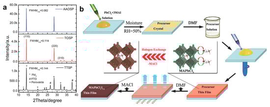 (a) X-ray diffraction pattern of chloride–iodide perovskite films prepared by traditional and aquointermediate processes. (b) Schematic view of the aquointermediate process for the fabrication of chloride–iodide perovskite film [].