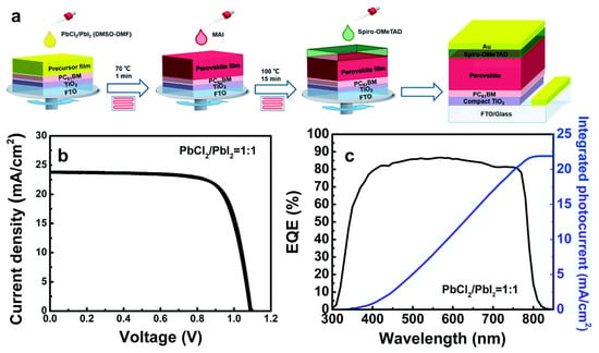 There is a long-standing debate that the exact concentration of Cl in the final film does not reproduce the stoichiometry of the precursor solution. Cl incorporation into I-based perovskite film is only possible at relatively low concentrations []. Precursor compositions determine the Cl contents in chloride–iodide perovskite and the photovoltaic performance. Therefore, it is necessary to investigate the effect of components’ molar ratio in precursor solutions such as MAI, MACl, PbI2, and PbCl2.
