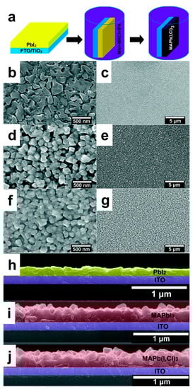 (a) Schematic diagram of the dip-coating process. Scanning electron microscopy images of PbI2 (b,c,h), MAPbI3 (d,e,i), and MAPbI3−xClx (f,g,j) films. From [].