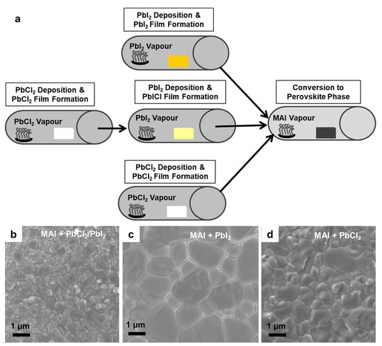 Vapor-phase deposition can be performed in two ways: the co-evaporation of individual precursor elements or the sequential evaporation of precursor elements. Ngqoloda et al. [] fabricated chloride–iodide perovskite films through facile two-step and three-step sequential vapor-phase deposition. In two-step vapor-phase deposition, PbCl2 and PbI2 are deposited in the first step and converted to chloride–iodide perovskite in the second step. In three-step vapor-phase deposition, first PbCl2 is deposited, followed by PbI2, and chloride–iodide perovskite is formed in the third step. These deposition steps are shown schematically in Figure 6a, together with the conversion to chloride–iodide perovskite. It is seen in Figure 6b–d that more compact morphology is obtained with three-step compared to two-step vapor-phase deposition. Liu et al. [] observed crystalline features on the length scale of hundreds of nanometers in scanning electron microscopy images from the vapor-phase-deposited chloride–iodide perovskite film. In contrast, crystalline features on a length scale of tens of micrometers were found in solution-processed deposited chloride–iodide perovskite film. The superior uniformity of the vapor-coated perovskite film results in a substantially improved PCE of 15.4%. In another work, Liu et al. [] also found a smooth surface, good surface coverage, and better crystalline size uniformity with vapor process deposition.