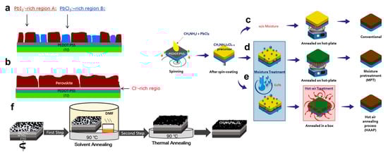 In perovskite film preparation, the solvent plays a critical role. Solvents not only play the role of dissolving the solutes but also determine the crystallization route. The chemical kinetics of perovskite precursors influence the microstructural properties []. Crystallization depends on the capacity of the precursor components to interact with each other in the solvent. Different solvents have different evaporation rates and solubilize the precursors in various ways due to their different chemical kinetics. Different solvents and solvent additives modify the structural uniformity and crystallinity of the perovskite film []. Here, we will discuss the solvent’s role in incorporating Cl into I-based perovskites.