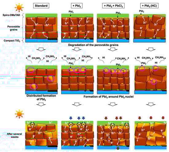 - Ueoka, N.; Oku, T. Stability Characterization of PbI2-Added CH3NH3PbI3–XClx Photovoltaic Devices. ACS Appl. Mater. Interfaces 2018, 10, 44443–44451. [Google Scholar] [CrossRef]