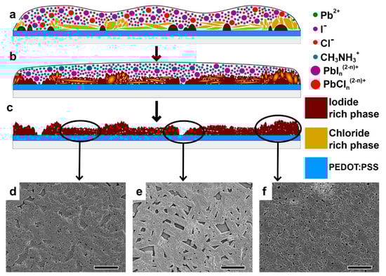 After further annealing, the light-brown film (see Figure 2b) transforms into dark brown (see Figure 2c), indicating the presence of a higher quantity of MAPbI3 or mixed chloride–iodide perovskite. The possible chemical reaction is demonstrated as follows: