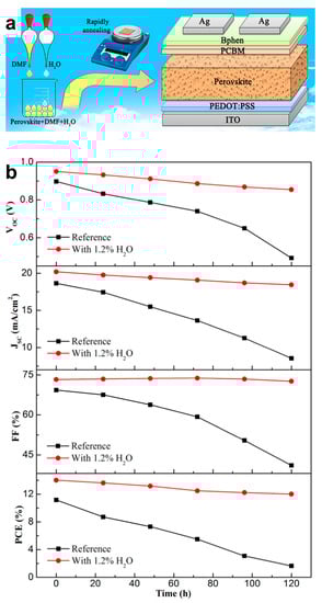 - You, J.; Yang, Y.; Hong, Z.; Song, T.-B.; Meng, L.; Liu, Y.; Jiang, C.; Zhou, H.; Chang, W.-H.; Li, G.; et al. Moisture Assisted Perovskite Film Growth for High Performance Solar Cells. Appl. Phys. Lett. 2014, 105, 183902. [Google Scholar] [CrossRef]