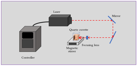 Iron metal plate with a thickness of 1.0 mm was cut into pieces 1.5 × 3.0 cm2 in size which were then sonicated in ethanol for 5 min. After drying in air, the plates were placed in a quartz cuvette with 15 mL of chloroform. During ablation for 20 min, the produced colloids were magnetically stirred (Figure 1). A nanosecond pulsed Nd: YAG laser with the fundamental wavelength of 1064 nm was used for preparing iron chloride-based NPs. The experimental setup is shown in Figure 1, while more details on both the setup and laser used can be found elsewhere [11,27,32,41,42].