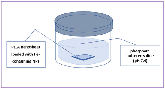 We first prepared water-soluble nanoparticles based on Fe ions via ablating iron plate by laser in chloroform. The method was chosen as we aimed at generating chloride/oxide-based nanomaterials which would demonstrate solubility in contact with water. The prepared nanoparticles were found to be of proper sizes (below 100 nm) and based on Fe chloride and oxide phases, which made them suitable for incorporation into PLLA nanosheets via spin-coating. After characterization, the prepared Fe-containing nanomaterials were embedded into PLLA nanosheets which were fabricated via spin-coating. To test their ion-releasing properties, the prepared nanosheets were immersed in a buffered liquid (pH 7.4) at 37 °C, where their Fe ion release was monitored over time.