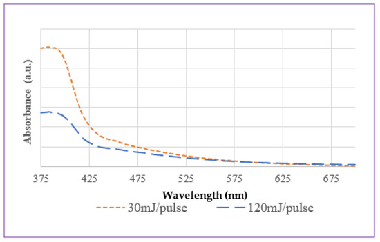 UV-visible spectra of Fe-based colloids prepared using ns-pulsed laser at 30 (orange) and 120 mJ/pulse (blue).