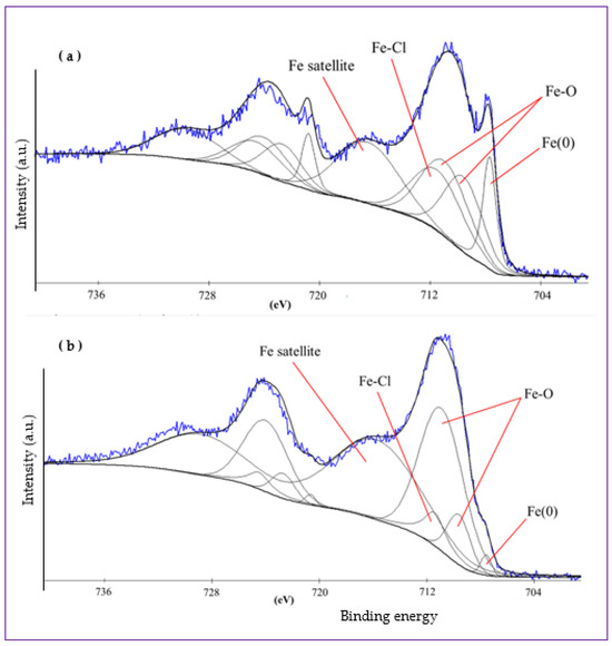 Figure 8 presents XPS Fe 2p spectra of Samples A (a) and B (b). Corresponding Cl 2p and O 1s spectra are shown in Supplementary Materials Figures S1 and S2, respectively. As iron is a transition metal, the Fe 2p spectra of both samples presented in Figure 8a,b demonstrate doublets, i.e., peaks at Fe 2p3/2 (between ~705 and ~723 eV) and Fe 2p1/2 (between ~718 and ~735 eV). For brevity and convenience, below we only focus on the Fe 2p3/2 peaks which are easier to analyze and thus are more informative.