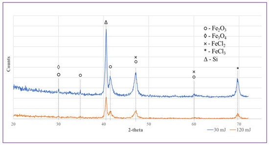 XRD patterns of Samples A (blue) and B (orange) prepared at 30 (blue) and 120 mJ/pulse (orange) and deposited on Si wafer.