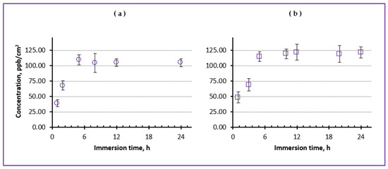 Release of metal ions from NS samples was studied by means of inductively coupled plasma mass spectroscopy (ICP-MS). The samples were immersed in flasks with 40 mL of PBS solution (pH 7.4) at 37 °C to simulate human body conditions (see Figure 4). To analyze the concentration of Fe ions over time, aliquots of 1 mL were taken and analyzed after certain periods of time. To determine the concentration of metal ion in the analyzed solution, calibration curves were plotted for each analyzed element using standard solutions, as previously reported elsewhere [46,47,48]. After each sampling, a volume of 1 mL of PBS was added to the sample. For each sample, measurements were carried out in triplicate, after which the obtained results were averaged. Nanosheets incorporated with laser-ablated Fe-containing NPs, as well as their counterparts incorporated with commercially available ZnO and Fe2O3 NPs, were evaluated in terms of Fe or/and Zn ion release.