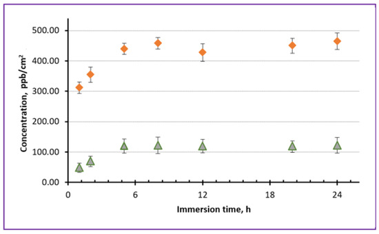 For comparison, at the next stage, we also prepared NSs incorporated with both Fe and Zn ions, for which Sample B and commercial ZnO NPs were used. Figure 11 demonstrates how a PLLA NS embedded with two types of NPs released Fe (triangles) and Zn (diamonds) ions when immersed in physiological solution at pH 7.4. It is seen that different levels of concentration were achieved by Fe and Zn ions released by this NS, which was intentionally embedded with different amounts of nanoparticles. Importantly, however, the maximum level of both Fe and Zn ions was achieved after around 4–5 h of immersion. This probably implies that it is the permeability of the PLLA NS that played an important role in releasing ions of the two types. As mentioned above, the difference in released concentration of Fe and Zn ions can be explained by the different amount of NPs used during spin-coating. Here, we used the same concentration of Sample B to prepare this NS (0.3 mg/mL of Fe in chloroform), while 1.0 mg/mL of ZnO NPs was added into the same dispersion.