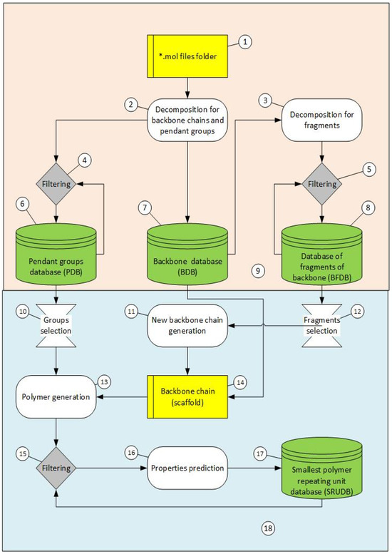Figure 1 shows a block diagram of our algorithm for the database generation steps. Point 1 in Figure 1 corresponds to the structures of existing polymer SRUs extracted from the publication [11]. We considered the generation of two types of databases: databases of structure fragments (FDBs) from the literature data (Figure 1, points 6, 7, 8) and a polymer SRU database (SRUDB) (Figure 1, point 17). The FDBs in turn consist of three databases: Pendant Groups (PDB, Figure 1, point 6), SRU Backbones (BDB) (Figure 1, point 7), and Fragments of SRU Backbones (BFDB) (Figure 1, point 8).