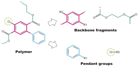 As mentioned above, the structures of the existing polymer SRU [11] were used as starting data for fragment generation. They were manually extracted from [11] and saved as computer-readable *.mol (MOL) files (MDL format) [43] (see Figure 1, point 1). Next, these structures were decomposed into backbones (Figure 1, point 7) and pendant groups (Figure 1, point 6) and stored in their databases—BDB (Figure 1, point 7) and PDB (Figure 1, point 6). The backbones were further fragmented to form the BFDB (Figure 1, point 8). Using FDBs to create polymer SRUs, it is possible to vary the structure of the backbone and use different pendant groups.