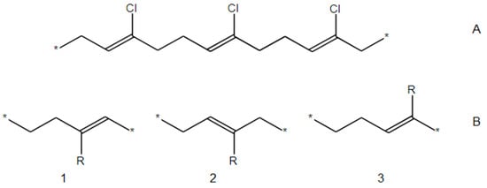 (A) polychloroprene and (B) variants (1–3) of the polychloroprene backbone fragments stored in the BFDB. R denotes the chlorine atom connection point. Here and after the asterisk “*” denotes a continuation point of the backbone.