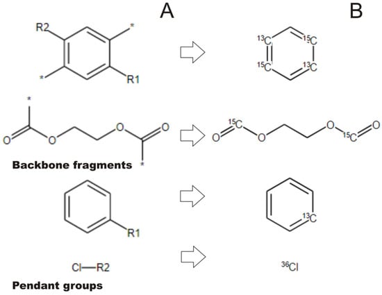 Figure 4 shows an example of isotopic labeling of polyethylene terephthalate fragments (Figure 2), where 13C and 36Cl are connecting points of the pendant group, 15C is continuation point of the backbone.