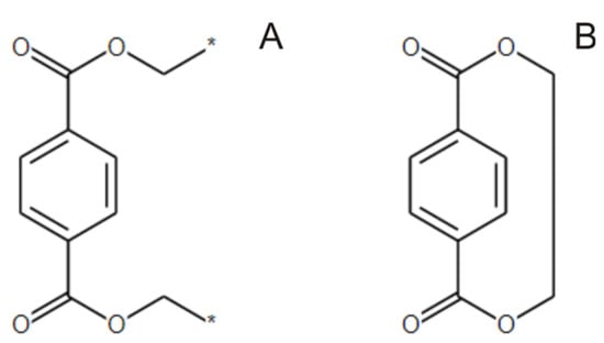 (A) PET (unable to calculate standard InChIKey for this structure). (B) Results in transformation of PET to the cyclic structure before standard InChIkey calculation (InChIkey = MMINFSMURORWKH-UHFFFAOYSA-N).