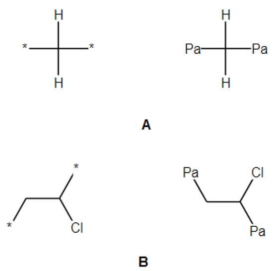 The number of identical fragments in the repeating unit of the polymer was counted in transformed structures, cyclic (Figure 6) or with Pa atoms (Figure 7). It should be noted that if the topological distance between the atoms marked as the continuation of the backbone is zero (a pair of star atoms is connected to one atom), then such a structure is considered an SRU. Note that no SRU contains less than one atom. If the topological distance is equal to one (a pair of star atoms is connected to a pair of neighboring atoms), then their topological equivalence is checked. To do this, starting from each atom of a pair of neighbors, a tree is created consisting of the paths from the selected atom to the next atoms, from these to the next, and so on, until the structure is traversed. Pendant groups are taken into account when forming a tree whose vertices are the chemical symbol of the atom and the type of bonds (single, double, triple, aromatic) used as paths to that vertex. The tree is sorted to make it canonical and to speed up further comparisons. Then, the trees for each pair of atoms are compared. If they match, a pair of atoms is considered topologically equivalent and they are assigned the same identifier. If the identifiers of a pair of neighbors are the same, then such a structural formula of the polymer contains two SRUs. Therefore, to obtain a structural formula with one SRU, one of the neighboring atoms is replaced by protactinium and all atoms attached to it are removed. Examples of such compounds are polyethylene (*-CH2-CH2-*) and Teflon (*-CF2-CF2-*). These structures are converted to Pa-CH2-Pa and Pa-CF2-Pa, respectively.