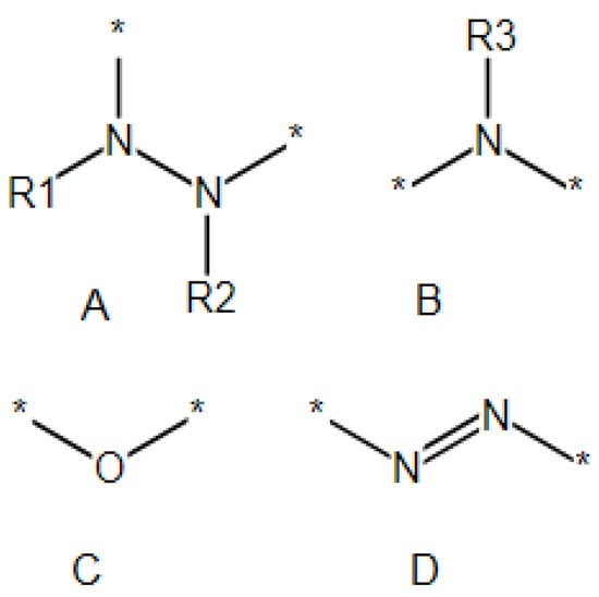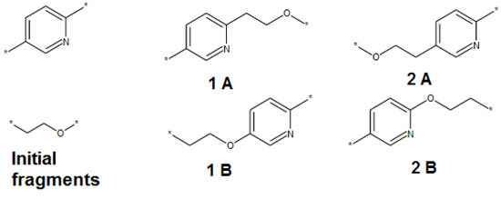 Consider the ambiguity of the generation process associated with the non-equivalence of the “head” and “tail” of the backbone fragments. This problem is illustrated in Figure 9, which shows all four possible chemical structures for polymers of oxyethylene and 2,5-pyridinediyl. However, due to the possibility of representing the SRU in different ways, using any acyclic single bond to indicate chain continuation marks, two unique structures are generated, denoted by the numbers one and two. It can be seen from Figure 9 that the 1A–1B and 2A–2B structures are equivalent. Therefore, when generating new backbones, it is important to consider and vary the orientation of the fragments (head-to-tail and head-to-head).