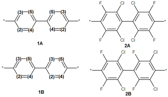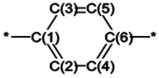 As an example of how to calculate the number of SRUs in the backbone for compounds with a topological distance greater than one between atoms marked with asterisks, consider poly(p-p-′)-biphenylene (see Figure 8). It is indicated as poly(p-,p-′)-biphenylene in Figure 8A. First, the equivalence of the atoms in the main chain is determined and a repeating cyclic unit of the polymer is formed (Figure 8B). A substituent tree was then constructed for each backbone atom, including the pendant groups, as described above. After comparing the trees, all atoms with identical environments were assigned the same integer number. For the cyclic structure of poly(para,para’)biphenyl, there are only two types of atomic environment, numbered 1 and 2 (Figure 8B). In total, there are four atoms with a conditional topological identifier of one and eight atoms with an identifier of two. For atoms of the first type, the concept of a minimum number of equivalent atoms NMinEq is introduced. In this example, NMinEq = 4.