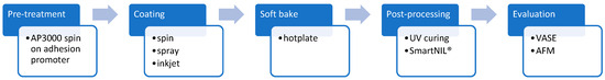 For the study of the spin- and spray-coating process, EVG 100® series coating equipment was used as this system can accommodate both process flows. Inkjet coating tests have been performed on a ImageXpert system equipped with a Xaar print head. In order to allow for a high degree of freedom in terms of materials choice to address the desired range in terms of viscosity and in refractive index, a syringe-based dispense method was employed. A NIL resin without fillers (n = 1.5; EVG NIL UV/A) has been investigated as well as a high refractive index resin containing TiO2 nanoparticles (n = 1.9; INKRON). Single-side polished, 200 mm-diameter, (100) orientation silicon wafers prepared with an adhesion promoter (AP3000, Rohm and Haas Electronic Materials) were used as substrates for all tests. Thin resin layers (typical for NIL in the range of 100–200 nm) were processed in a single coating step using precise dispensing. When using spin coating to achieve a specific resin layer thickness, the viscosity of the resin and the spinner speed are the most important parameters. For spray coating, the solvent content of the resin, the speed of the nozzle moving across the substrate, and the dispense rate define the final layer thickness. The resin thickness of an inkjet-coated layer is, like spray coating, defined by the solvent content, the dispense rate (drop size, number of droplets), and the speed profile of the stage. In Figure 2, the process flow is illustrated, and in Table 1, the investigated parameters are listed: for spin coating the spinner speed, for spray coating the dispense rate and for inkjet coating the droplet size. After each coating, the solvent was removed by a soft bake process performed on an EVG 105® hotplate. The soft bake temperature and duration varied depending on the resin type and solvent content between 80 °C and 120 °C for either 60 s or 90 s.