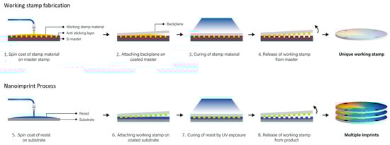 Schematic illustration of the process flow. Steps 1–4 show the typical manufacturing steps for creating a transparent working stamp. Steps 5–8 illustrate the actual imprint process which can be repeated multiple times using the same working stamp. (Reproduced with permission from Thanner, C. and Eibelhuber, M. [5]).