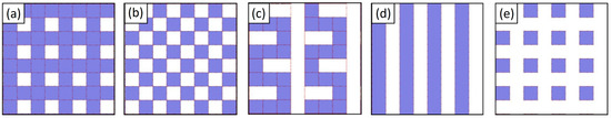 Schematic illustration of the different geometrical layouts used to investigate the filling behavior of nanostructures: (a) crossbar, (b) checkerboard, (c) meanders, (d) line and space (L/S), and (e) pillars. (Reproduced with permission from Thanner, C. and Eibelhuber, M. [5]).