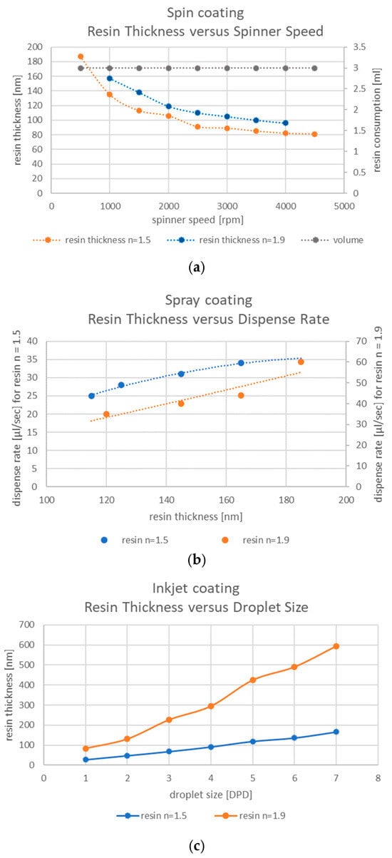 Spin coating, as shown in Figure 1a, is the most established method for depositing a UV-NIL resin film on a substrate. The spin coating process starts with dispensing the resin solution on the substrate surface. The wafer is spun subsequently at high speed to homogenize the layers. The final film thickness is controlled by the spinning speed, the surface tension, and the viscosity of the resin precursor [8]. However, the material use efficiency of spin coating technique is very low: generally, about 95–98% of the material is spun off and disposed of during the process, while only 2–5% of the material remains on the substrate for use after spin-off [8]. An alternative coating technique with reduced resin consumption is shown in Figure 1b: spray coating is a promising technique for depositing thin and homogenous layers on substrates with no limitation on shape, size, and surface topography [9,10]. During the coating process, the wafer is held static while an ultrasonic spray nozzle is moving with a defined speed profile across the substrate. The film thickness is determined by the viscosity of the resin, the type, and the speed of the spray nozzle as well as the dispense rate. Another static coating technique enabling low resin consumption is the inkjet coating, shown in Figure 1c. Inkjet coating is utilizing single drops of resist allowing for precise volume control and eliminates the typical resist waste encountered with spin coating [11,12,13]. Droplets with defined volume of material are placed on predefined positions, which enable the achievement of highly customized coatings adjusted to the layout of a specific NIL stamp. The film thickness is defined by the viscosity of the resin, the droplet size, and the placement density.