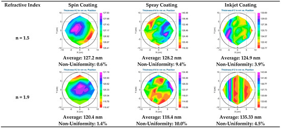 The uniformity evaluation across the 200 mm diameter wafer in Figure 9 confirms the indication that spray coating is causing an un-even distribution of the nanoparticles in the high refractive index resin which causes variation in the layer thickness and the refractive index. The droplets produced by the piezo spray coat nozzle at high frequency may already contain a different amount of nanoparticles. The distance between the nozzle and the wafer surface is in the range of several cm, and it has to be assumed that differently loaded droplets merge in the time of flight, and additionally, the exhaust during the spray process can withdraw an uncontrolled number of nanoparticles. The variation in droplet size and nanoparticle contingent when contacting the wafer as well as the exhaust effect could explain the non-uniform distribution and the lower refractive index using spray coating.