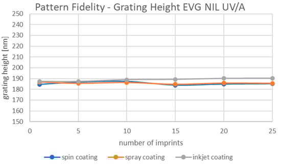 Ensuring a reliable, stable pattern fidelity with a high number of imprints per working stamp are the main criteria to fulfill for a successful application based on SmartNIL® process. A 400 nm line/space grating template has been used to imprint 25 wafers for each type of coating process (spin, spray, and inkjet coating). The grating height was measured using AFM. Figure 10 shows a stable pattern height of 187 nm ±3 nm over 25 imprints for all three coating techniques used. These data support the conclusion that there is no influence of the coating technique when using the same working stamp with a specific geometry.