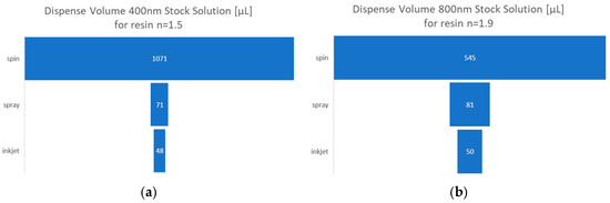 To compare the real resin consumption for achieving a 125 nm-thick layer on a 200 mm diameter wafer, standard composition solutions have been used and diluted according to the coating technology applied. For the filler-free resin, a 400 nm EVG NIL UV/A standard solution was used and modified with different solvent ratios to achieve the target layer thickness of 125 nm. As presented in Figure 11a, the filler-free resin consumption used for the spin coating process is 15 times higher compared to spray coating and 22 times higher compared to inkjet coating. This is an expected result as in the spin coating process most of the material is spun-off from the surface due to the high centrifugal forces during spinning process, whereas spray coating and inkjet coating are static coating processes. For the high refractive index resin, 800 nm standard composition solutions were used. It was necessary to dilute the standard solution for spin coating and for spray coating to achieve the target layer thickness of 125 nm, whereas the inkjet standard composition solution could be used without further modification. Figure 11b shows, similarly to the filler-free resin, a much higher resin consumption based on the standard composition solution for spin coating compared to spray and inkjet coating.