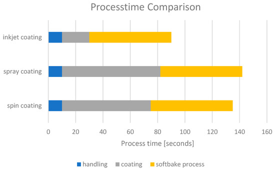 In addition to the resin consumption, the process time for coating is an important factor for production. Assuming that the process times necessary for robot handling and the final soft bake to remove the solvent are similar for all three coating techniques, inkjet coating provides the fastest coating process time (Figure 12).