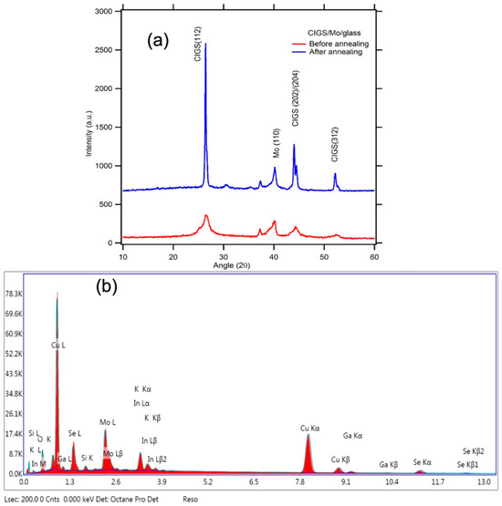 (a) XRD patterns of CIGS films. (b) EDX spectral analyses of the top surface of CIGS material.