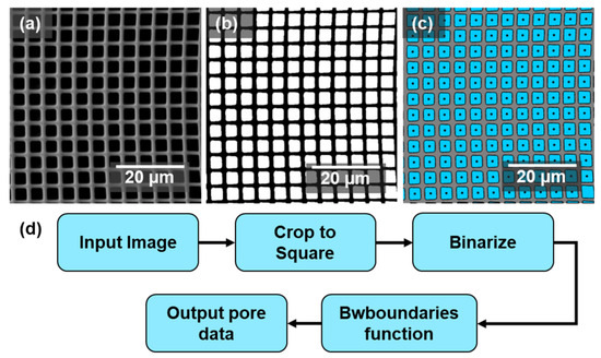 Visualization of the MATLAB image processing script process: (a) depicts the input SEM image for a membrane fabricated with 5 µm hatching pitch, 15 µm thickness at 65 mm/s speed, cropped to square; (b) is the image after undergoing the thresholding process; (c) shows the final areas defined by the ‘bwboundaries’ function, outlined in black and highlighted in blue. Additionally, centroids of each pore are marked with black points, excluding those overlapping with the edge that are omitted from pore analysis, and (d) shows a flow chart detailing the MATLAB image processing program.