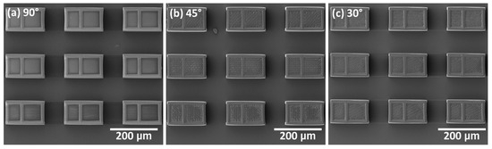 The successful incorporation of membranes into the printed tables is demonstrated in Figure 5, which presents SEM images of 3 × 3 sections of the characterization arrays. These arrays were printed with membranes fabricated using 4 µm hatching pitches at varying hatching angles of 90°, 45°, and 30°. The SEM images reveal the structural integrity and uniformity of the printed membranes, confirming their successful integration into the tables.