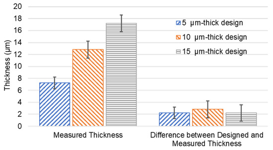 Membrane thickness is a crucial parameter that directly impacts diffusion across a membrane. The bar chart in Figure 6 depicts the measured thicknesses of all 90° hatching angle membrane types with thicknesses of 5, 10, and 15 µm, as well as the disparity between the designed and measured thicknesses. This visualization offers a clear representation of the observed differences in membrane thickness across various designs. The analysis revealed a consistent trend across all printed membrane types: the actual membrane thickness consistently exceeded the designed thickness by around 2 µm, this value corresponds to the estimated voxel height of the 25× objective lens with the Nanoscribe printer.