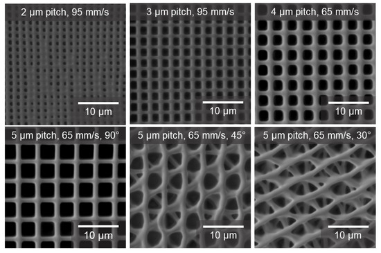 Using the slicing method and printing parameters outlined in the Methods section, a variety of pore structures were fabricated. Figure 7 showcases membranes with a hatching angle of 90° and pitches of 2, 3, 4, and 5 µm, respectively. Additionally, it includes 5 µm pitch membranes with hatching angles of 45° and 30°. All membranes were printed at 100% power and 15 µm designed thicknesses. The 4 and 5 µm slicing pitch membranes shown were printed with 65 mm/s speed, and the 2 and 3 µm slicing pitch membranes shown were printed with 95 mm/s scanning speeds. These images offer a clear visual representation of the variety of pore structures observed.