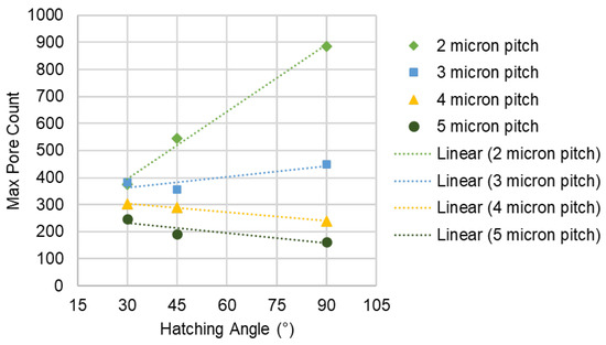 Plot of the maximum number of pores counted per sample type based on hatching pitch and angle.