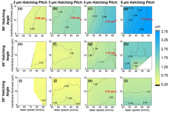 Contour plots of hydraulic diameters as a function of membrane thickness and laser speed for membranes fabricated with 100% power at (a–d) 90°, (e–h) 45°, and (i–l) 30° hatching angles, with hatching pitches of (a,e,i) 2 µm, (b,f,j) 3 µm, (c,g,k) 4 µm, and (d,h,l) 5 µm. Key membrane parameters referenced in the text are highlighted with a red cross and labeled with the corresponding hydraulic diameter.