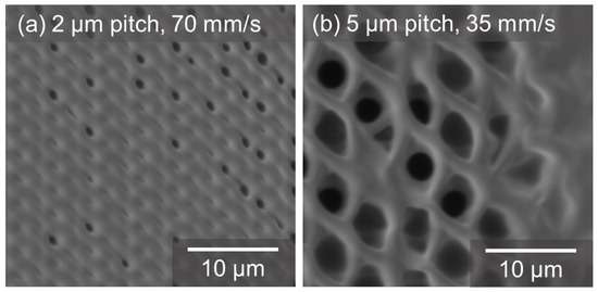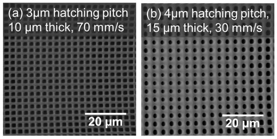 SEM images of membranes fabricated at 100% power: (a) a 3 µm hatching pitch, a designed thickness of 10 µm, and a laser speed of 70 mm/s; and (b) a 4 µm hatching pitch, a designed thickness of 15 µm, and a laser scanning speed of 30 mm/s. Both print settings result in a pore hydraulic diameter of 1.9 µm. However, (a) results in a porosity of 38%, while (b) results in a porosity of 22%.